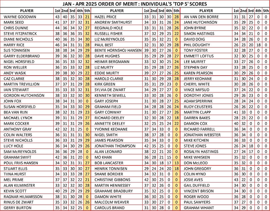 The first Order of Merit event of 2025 saw another new record of 217 different players competing across 12 games and the 'cut-off' handicap for Division 2 was 18.9, with anyone lower being in the Division 1 category. A total of 60 players managed to complete the full 4 qualifying games with 34 managing to hit the maximum 6 game tally & 12 managing 5 games.